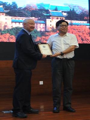 校长助理陈慧东为John Robertson教授颁发珞珈讲坛纪念证书。皇冠信用网