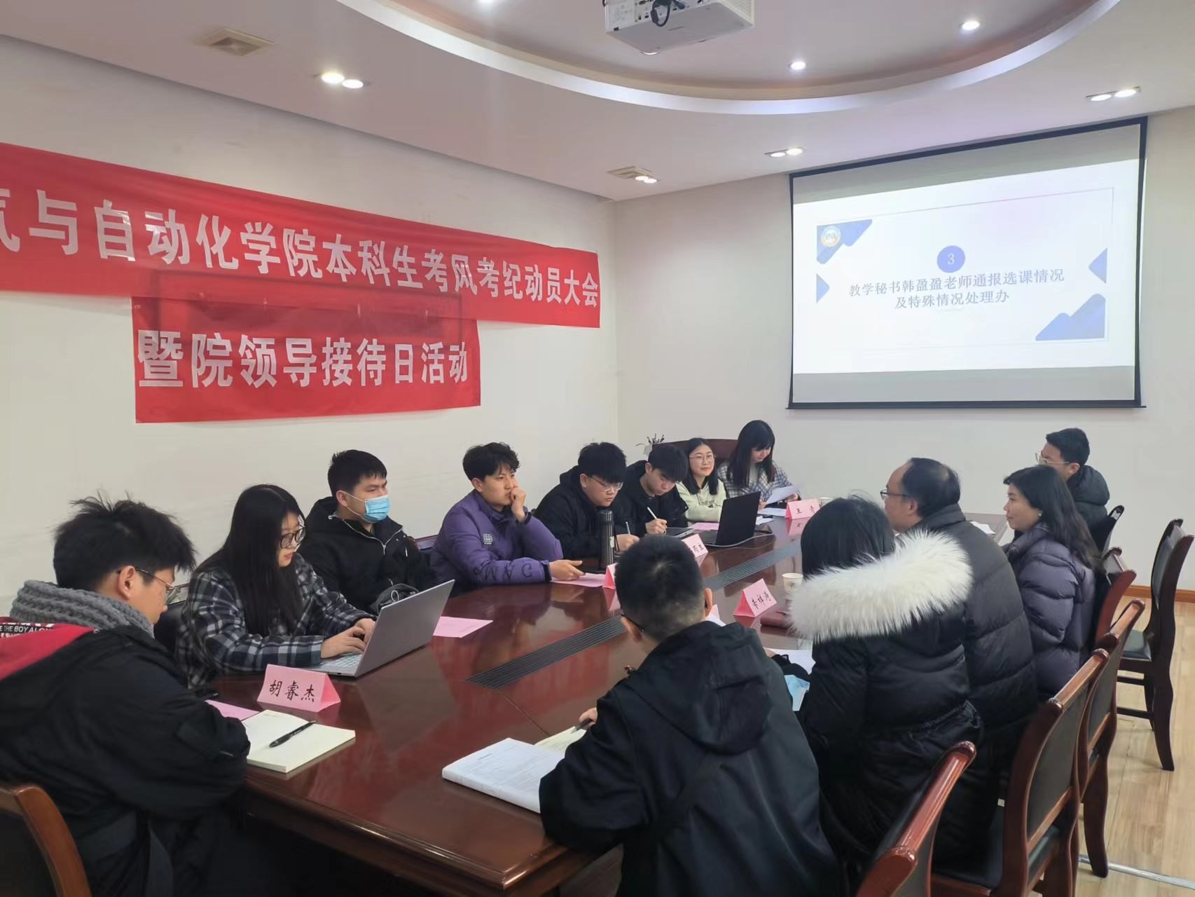 本科生考风考纪动员大会暨本科2022级第一次学生干部例会。学院党委副书记上官海兰老师、学院副院长专祥涛教授、班主任代表郭宇铮教授、本科生教学管理办公室秘书韩盈盈老师应邀出席,学院团委书记、本科2022级辅导员王青主持会议,班主任老师代表、2022级团总支委员、学生会主席团成员、各班支部书记、各班班长、学生代表参会。