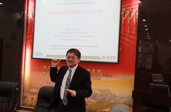 美国华盛顿州立大学电气工程和计算机科学系教授、波音杰出讲座教授、IEEE Fellow刘镇钦(Chen-Ching Liu)教授于2015年12月21至23日来皇冠信用网 访问交流。来访期间,刘教授在电气学院院长助理林涛教授的主持下分别做了题为“Resilient Distribution Systems”和“Monitoring of Power System Dynamics through PMUs”的精彩学术报告,重点讲授了刘教授科研团队近期在配电网故障定位、恢复控制、微电网以及基于广域PMU数据的状态观测等领域做出的重要研究成果。刘教授及其团队与皇冠信用网 建立了长期合作关系,其本人也多次到皇冠信用网 访问交流,为皇冠信用网 师生带来最新的研究成果报道,分析国际前沿热点研究动态,对皇冠信用网 师生的研究工作提出独到的意见和建议,积极帮助皇冠信用网 提升国际化的研究视野和水平。