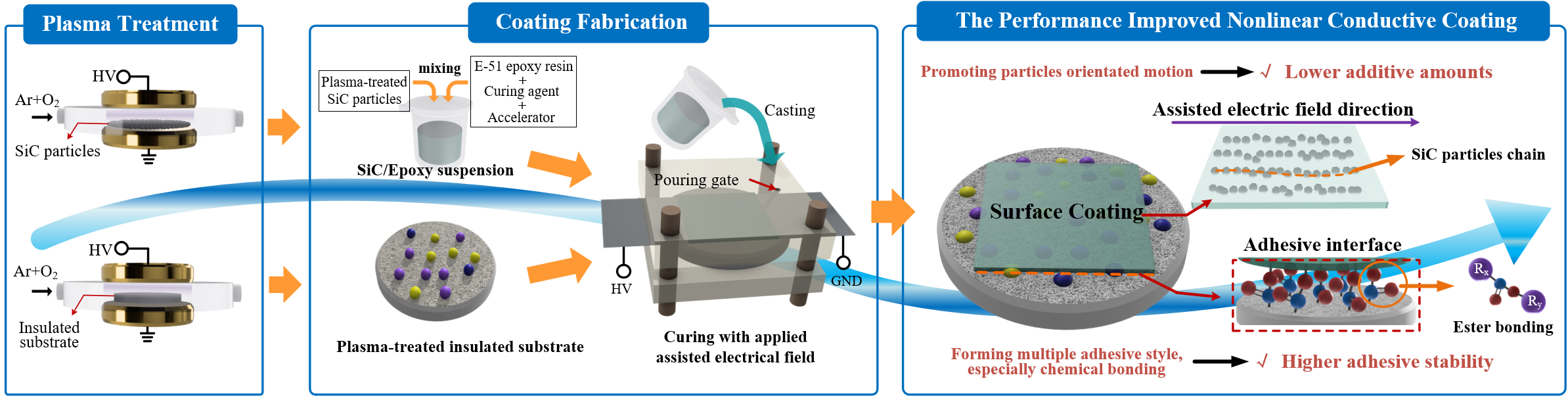 直流气体绝缘装备(包括直流气体绝缘组合电器GIS和直流气体绝缘线路GIL)的绝缘设计受制于其内部绝缘子表面电荷积聚引发的闪络失效风险,已成为我国特高压直流输电技术发展的“卡脖子”问题。在绝缘子表面涂覆非线性电导涂层能有效抑制电荷积聚,但传统涂层制备方法需提高导电填料浓度至超过逾渗阈值才能显著提升非线性电导特性,这会使得涂层界面结合力减弱、工艺性变差。为此,论文提出了一种基于等离子体技术的非线性电导涂层制备方法。