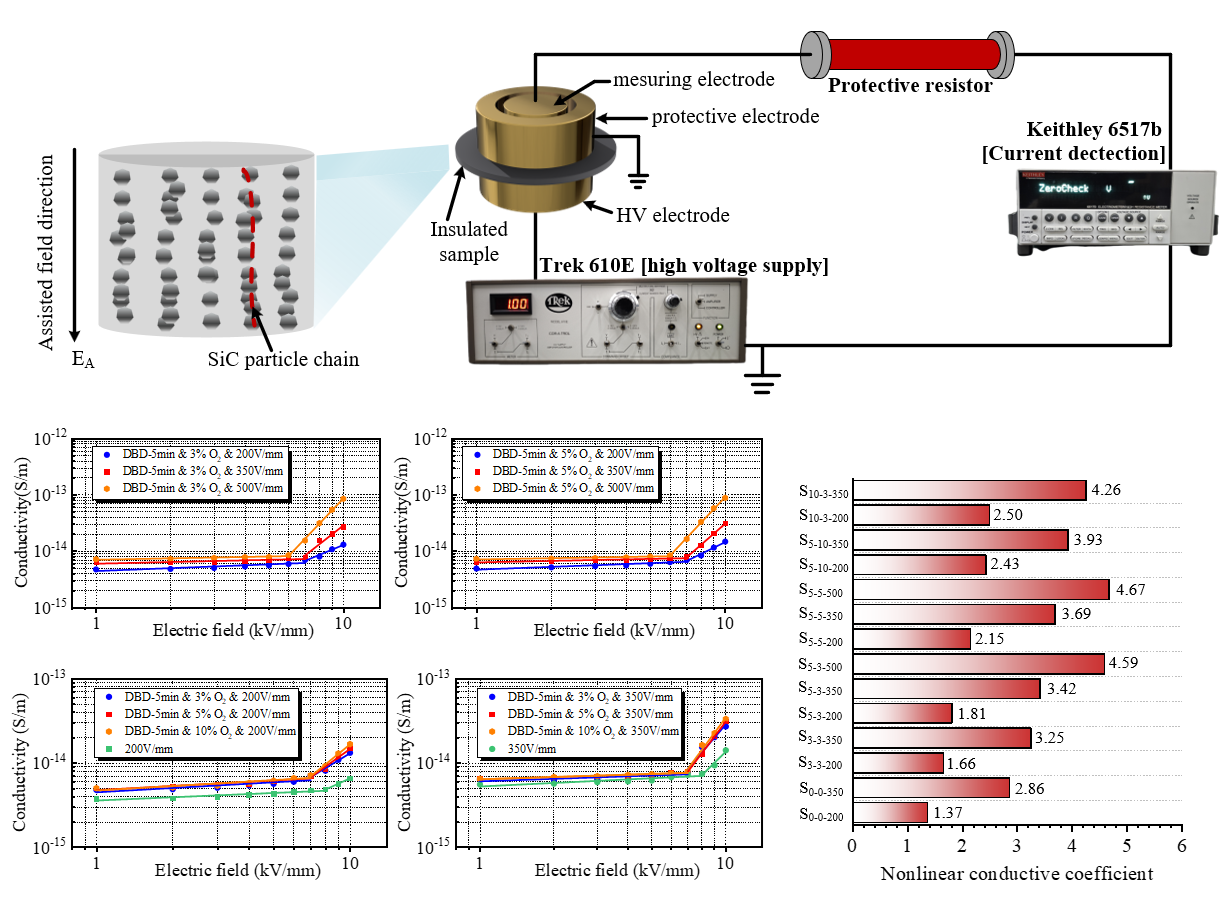 一方面,首次使用介质阻挡放电(DBD)处理后的SiC微粒来增强辅助电场下的微粒取向运动过程,获得了优异的微粒链状自组装效果,实现了微米碳化硅在5%低质量分数下的高效导电网络构建。