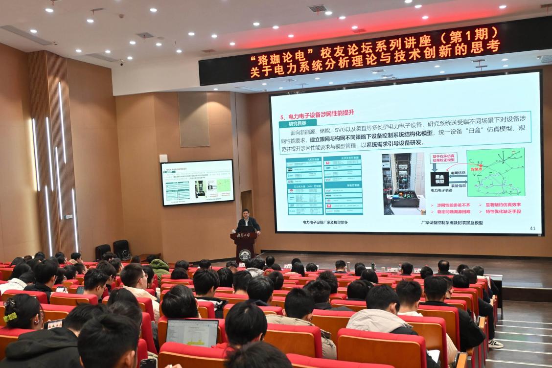 周勤勇以《关于电力系统分析理论与技术创新的思考》为题作专题报告。他以“科学革命的实质就是范式转换”为理论切入点,强调“没有技术创新就没有新型电力系统”,系统阐述了2030年前电力系统可能面临的关键问题与研究难点,并从理论创新、认知突破、技术路径三个层面对未来电力系统提出了具有前瞻性的研究建议。与会师生围绕新型电力系统发展中的理论与技术挑战展开深入探讨。学院向周勤勇教高颁发了“珞珈论电”校友论坛荣誉纪念牌。