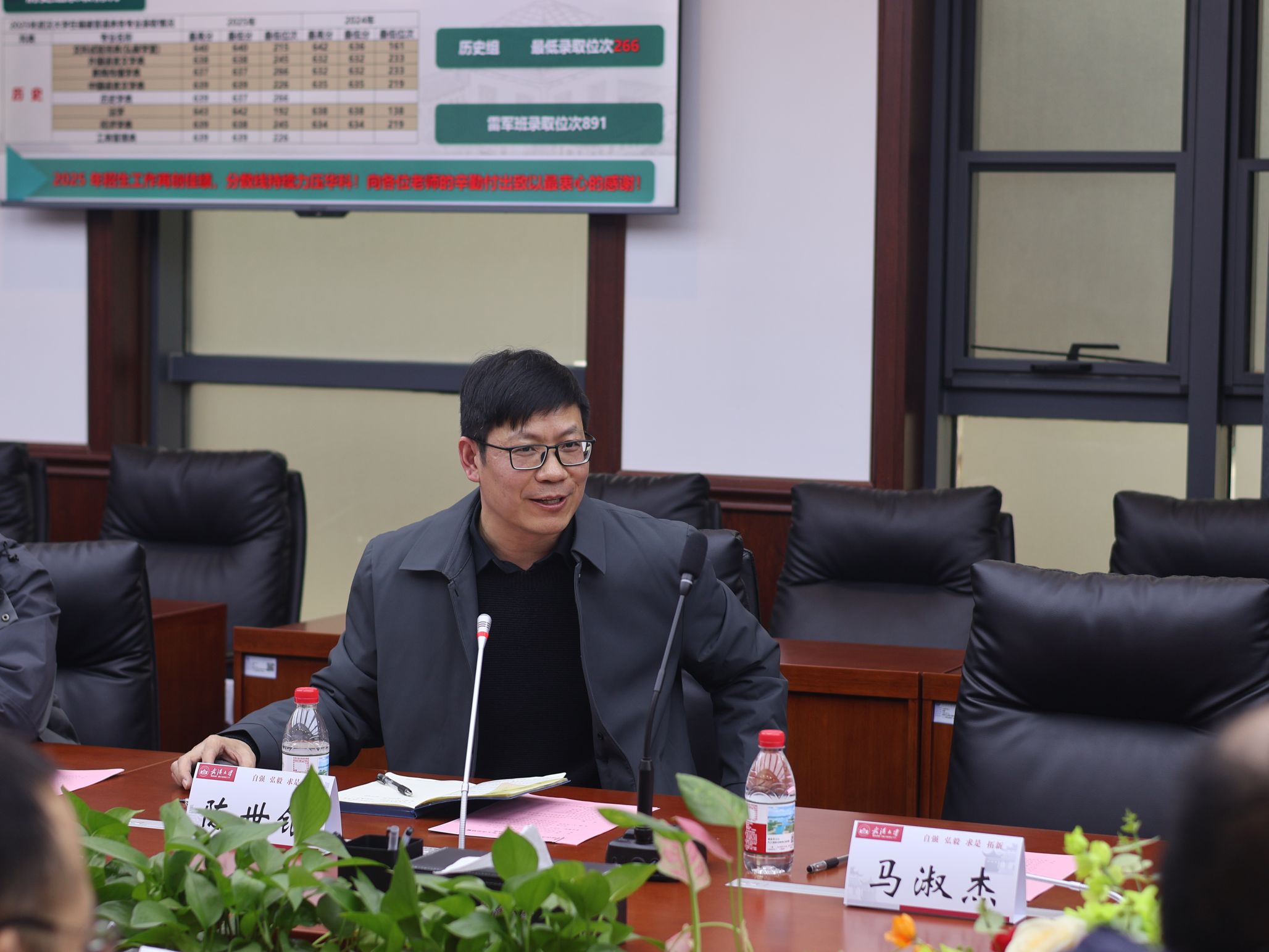 马淑杰作总结讲话。她向全体招生组成员的辛勤付出表示感谢。她充分肯定了招生组2025年取得的工作成效,认为全体成员凝心聚力、真抓实干,圆满完成了各项招生任务,为学校吸纳优质生源作出了积极贡献。她指出,要扎实推动报考引导工作前置至高中低年级阶段,尤其要在福州、厦门、泉州等核心区域建立早期目标生源培育机制;招生工作需贯穿全年,在优势区域持续深挖生源潜力,同时注重人员配置的合理性与工作效能的提升;进一步密切与福建校友会的联系,让校友们共同参与招生工作的总结与规划,凝聚多方合力,讲好武大故事,吸引更多优秀福建学子报考我校。