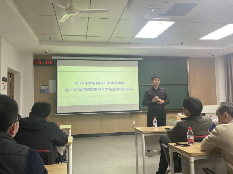 在主教A502召开2025年度科研工作总结暨2026年国家自然科学基金申报动员会。学院领导、科研骨干及青年教师参加会议。会议由学院学科办组织,旨在全面总结过去一年科研与基金工作成效,部署新一轮基金申报任务,并开展学术规范专题教育。