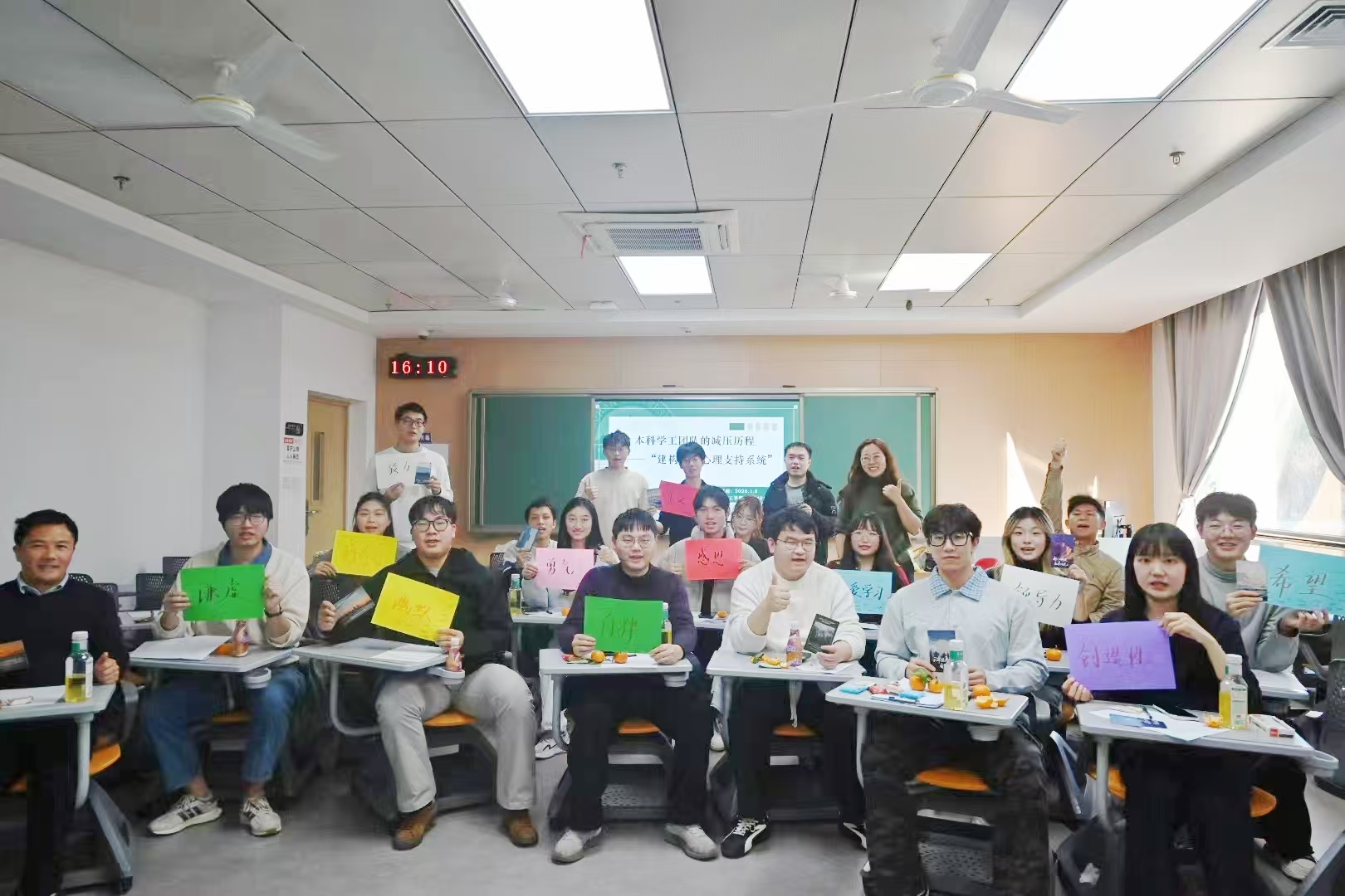 在“让我自豪”环节中,大家回溯成长路上的闪光瞬间,从学业引导的突破到善举的坚守,从团队的相伴到自我的蜕变,那些藏在记忆深处的积极力量被重新唤醒;关键词签名活动里,“创造性”“感恩”“勇气”“自律”等正向品质在相互认可中传递,展现出学工队伍共同秉持的职业品格;明信片互赠环节,一笔一划写下的祝福与期许,进一步筑牢了团队的情感纽带。
