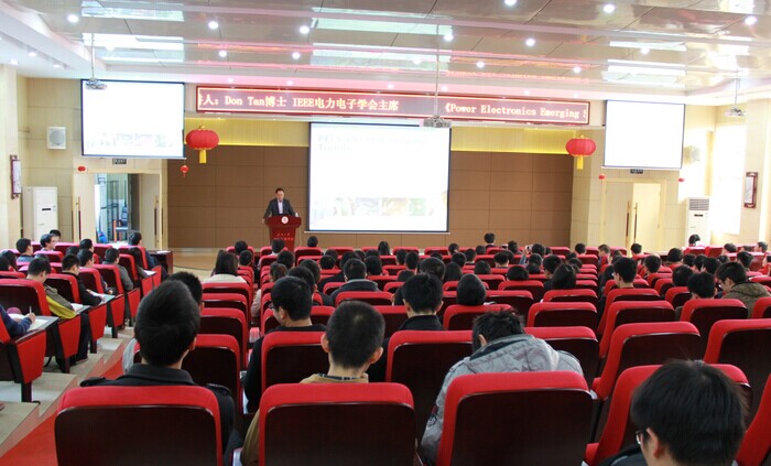 期间,Don Tan博士作了题为《PELS and PE Emerging Trends》的学术报告。Don Tan博士首先介绍了美国电气和电子工程师协会和电力电子学科的发展历程,并回顾了IEEE-PELS学会成立25周年的历史和所取得的成就。随后Don Tan博士就电力电子技术在电力系统、新能源应用、电动汽车、轨道牵引、节能环保、智能城市等领域的最新应用需求及研究前沿进行详细介绍,指出电力电子学科的最新发展方向,并展望电力电子技术未来热门研究领域。最后Don Tan博士在回答同学问题时,结合自身的人生经历对在座的同学们提出了宝贵的建议,鼓励大家积极参与世界高水平国际会议和学术活动。