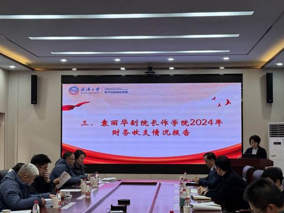 接着袁丽华副院长向大会作学院2024年财务收支情况报告,袁丽华副院长认真总结了学院2024年的财务收支情况,详尽介绍了2025年的财务工作重点,系统分析了学院财务现状,提出了以收定支、统筹兼顾、平衡协调的工作原则,对推动学院“双一流”建设,提高教职工待遇将起到重要作用。