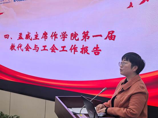随后袁佳歆副院长代表学院向大会作2024年工作报告,袁佳歆副院长全面且细致地回顾了过去一年学院在学科建设、人才培养、科研创新等方面取得的显著成果,展现过去一年的奋进足迹。此外,袁佳歆副院长还对学院未来发展规划进行了阐述,明确了下一阶段的工作目标与重点任务,为学院后续发展确定了方向。