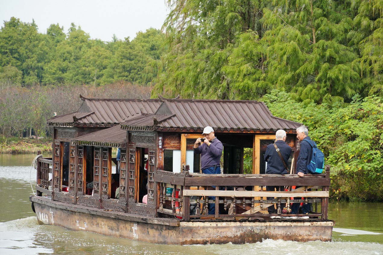 随后,老师们来到了景区码头,乘坐游船进入梦里水乡的乡野湿地进行观光。在游船上,老师们三五成群,边聊天边欣赏着两岸的美丽景色。游船缓缓驶过,一片片水杉林映入眼帘,随风轻轻摇曳。这种亲近自然的体验让大家放松了身心,完全融入到了宁静的湿地环境中。