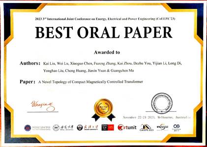 袁佳歆教授课题组与南网科研院合作撰写的论文“A Novel Topology of Compact Magnetically Controlled Transformer”被在澳大利亚墨尔本举办的CoEEPE 2023(2023年第三届能源、电力与电气工程国际会议)录用,并获得最佳口头报告奖。2023级直博生马光晨为论文通讯作者。