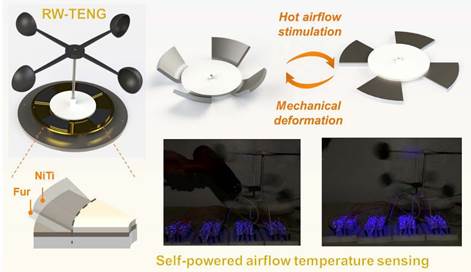 该研究构建了一种软接触工作模式的旋转式风驱摩擦纳米发电机(RW-TENG),利用形状记忆合金(NiTi SMA)对气流温度激励的优异热响应性能实现可调控的定转子接触面积,进一步利用器件在不同风速和温度下产生差异化的电信号实现了风温的自取能感知。如图1所示,室温下,NiTi SMA与转子叶片呈“弯曲”状态;当风温达到NiTi SMA的相变温度时,NiTi SMA恢复为“平坦”状态。作者系统优化了器件的结构参数并测试了其输出性能,发现NiTi SMA赋予RW-TENG优异的温度感知能力,所构建的油浸式变压器散热系统自取能气流温度监测装置表现出快速响应时间(109 s)、优异的抗干扰性能和长期稳定性。
