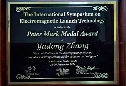 张亚东教授获颁电磁发射技术杰出贡献奖Peter Mark奖章(Peter Mark Medal for Outstanding Contribution to Electromagnetic Launch Technology),以表彰其在高效率电磁发射研究领域的贡献。国际电磁发射大会Peter Mark奖章于1983年设立,旨在表彰个人对电磁发射领域杰出的技术和教育贡献,迄今为止,仅有4名中国学者获得该奖项。