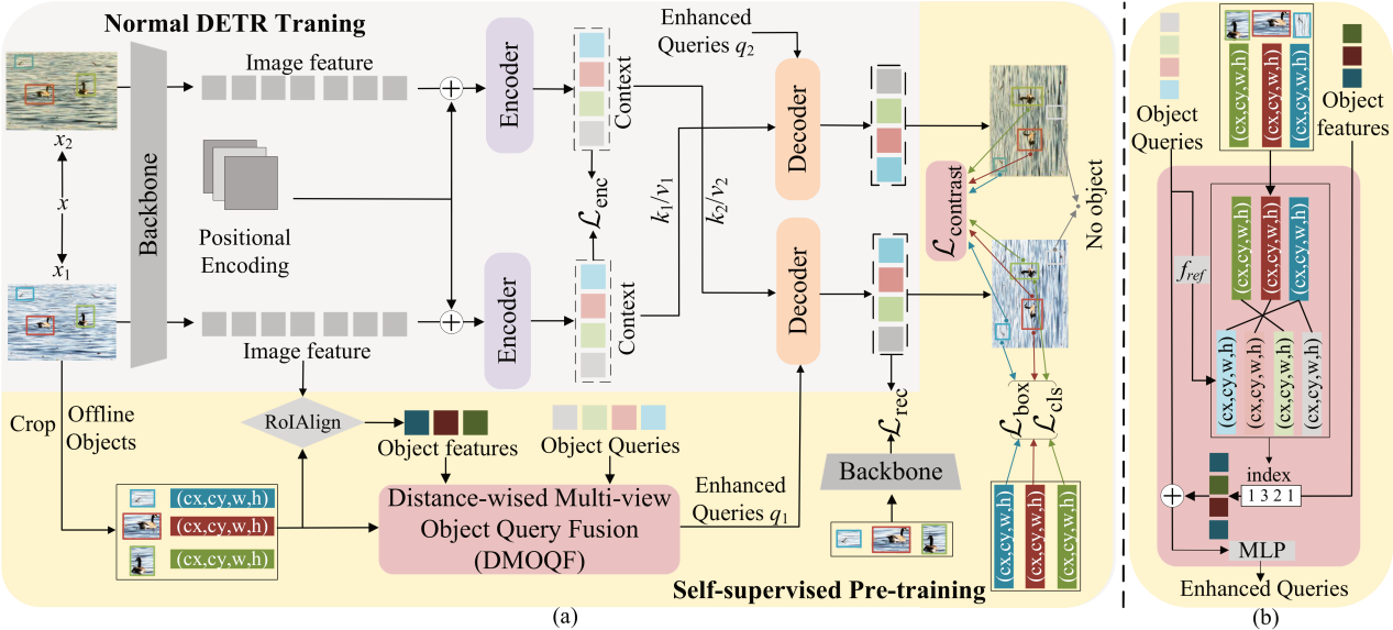 DETR 模型通过引入“对象查询(Object Query)”和二分图匹配机制,实现了端到端的目标检测。然而,DETR 对大规模标注数据依赖性强,且训练收敛速度较慢。现有的自监督预训练方法虽然在一定程度上缓解了数据依赖,但在与DETR架构的深度对齐方面仍存在两大局限: