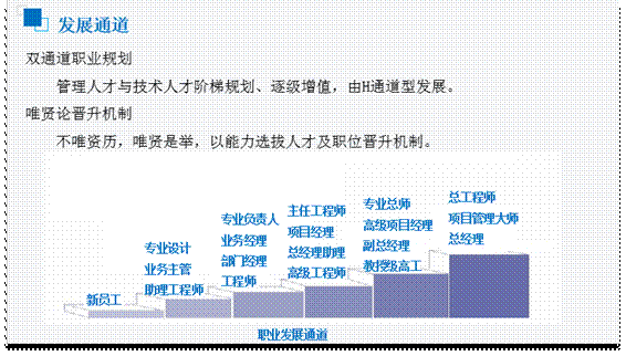 华东分院倡导“任人唯贤,唯才是用”的用人理念,将为每一位有才华、有作为的员工提供良好的职业发展环境和顺畅的职业发展通道,不论你想从事管理工作还是技术工作,只要您有能力、有信心,将在发展的不同阶段为您提供展示才华的空间和平台,为您的发展保驾护航。