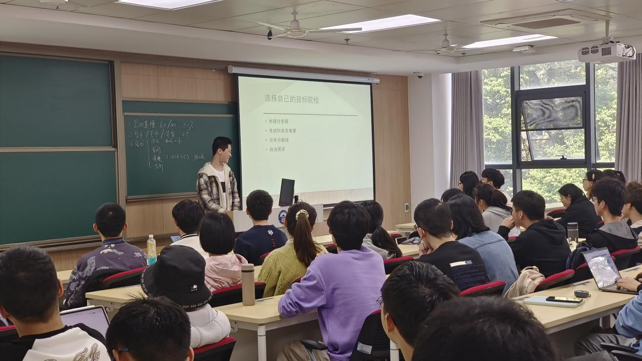 王向欣学长为大家分享了他备考的经历并推荐了各科的学习资料。他告诫同学们要根据自身情况确立目标院校,在备考时期要调整好自身心态并保持良好作息。最后又具体回答了同学们关于学习时间安排等几个问题。