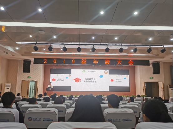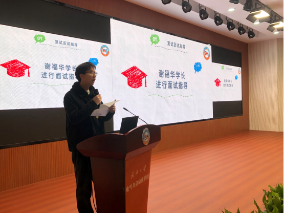 大会第一项是对考研复试情况的介绍。首先由谢福华学长和张文豪学长对同学们进行了面试指导,两位学长结合自身复试经历,阐述了一些考研复试注意事项,并着重强调了心态的重要性,既要从心理上高度重视面试又要保持一颗平常心沉着应对。