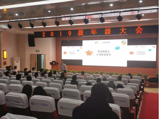 本科2019级组织召开了新学期以来的第一次年级大会,对考研、就业及出国相关情况进行介绍。学院副院长何怡刚教授、党委副书记上官海兰老师和本科生兼职辅导员靳展翔老师出席本次年级大会,2019级辅导员赵薇老师主持本次会议。研究生谢福华和张文豪受邀进行考研复试指导。