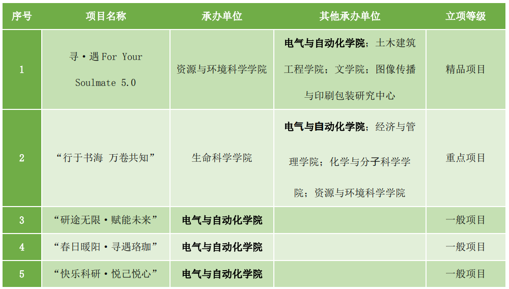参与申报的5项心理健康活动项目均成功立项,协办精品项目1项,协办重点项目1项,主办一般项目3项,其中“快乐科研·悦己悦心”项目是“研究生学业赋能:毕业焦虑‘阳光工程’”方向唯一立项,“研途无限·赋能未来”项目在“研究生学业赋能:前景规划‘领航员工程’”方向排名全校第二。