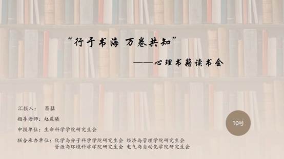 活动简介:本次“行于书海 万卷共知”读书会活动旨在缓解同学们的心理压力,感受生活的美好。在“个人成长”、“家庭”、“梦想”这三个大主题下选取书籍,让同学们在阅读中充分释放压力,与自我和解,另一方面在与同学的沟通交流中,促进同学间的友谊,帮助研究生们保持良好的心理状态,提高个人人文素养,提升心理健康素质。