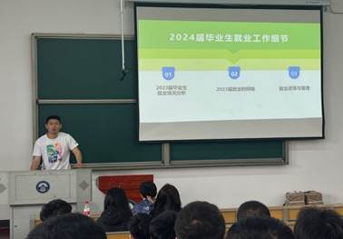 大会第二项,由研究生辅导员邹春航老师作就业分析及就业政策讲解。邹老师首先对学院23届研究生毕业生的总体规模、生源地分布、毕业去向、就业地区,行业分布、就业单位等相关数据进行了分析,让同学们更好地了解当前就业形势,为同学们就业选择提供了参考。此外,邹老师按照就业时间轴的顺序详细讲解了毕业年各时间段的注意事项,使同学们对就业的时间节点有了清晰的认识。最后,邹老师对学校就业管理政策,包括毕业相关手续办理流程、就业类别及其派遣方式、签约、毁约等内容作了详细的讲解。