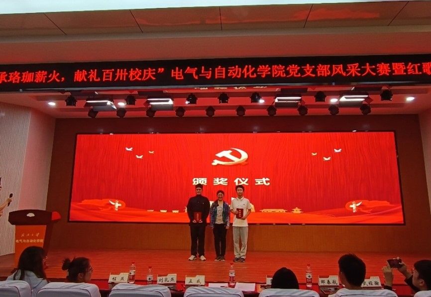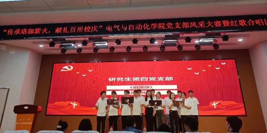 在电气报告厅举行“传承珞珈薪火,献礼百卅校庆”研究生党支部风采大赛暨红歌合唱比赛,本次比赛也将作为新生主题教育的一部分,激发同学们爱国爱党爱校之情。学院党委副书记孟威,党委组织员彭赟,团委副书记邹春航、刘乳燕,学生团委副书记武经瀚,院合唱团团长程燕出席比赛并担任评委。
