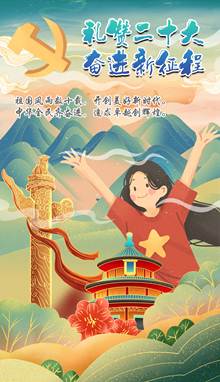 作品介绍:本作品主题为“礼赞二十大,奋进新征程”,以党徽、华表、天坛以及一位青年为主要元素。其中,党徽、华表和天坛象征着党领导人民进行革命、建设、改革所经历的光辉岁月,代表着我们党在这百年历程中所取得的伟大成就,突出“礼赞二十大”这一主题;那一位青年张开双臂,以昂扬的姿态奔向未来,展现了当代青年积极向上的精神风貌,同时与主题中“奋进新征程”相呼应。作品主题以毛笔手写字体呈现,作品背景中的群山融合山水画中青绿山水的特点,体现东方文化的美学特征,也对应大赛“书画”的核心。最后,“祖国风雨数十载,开创美好新时代。中华全民齐奋进,追求卓越创辉煌。”这一首小诗点明作品主旨。