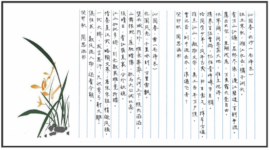 作品介绍:《沁园春·长沙》和《沁园春·雪》是无产阶级革命家毛泽东创作的词。前者通过对长沙秋景的描绘和对青年时代革命斗争生活的回忆,抒写出革命青年对国家命运的感慨和以天下为己任,蔑视反动统治者,改造旧中国的豪情壮志;后者描写北国壮丽的雪景,纵横千万里,展示了大气磅礴、旷达豪迈的意境,抒发了词人对祖国壮丽河山的热爱,并且议论抒情,重点评论历史人物,歌颂当代英雄,抒发无产阶级要做世界的真正主人的豪情壮志。