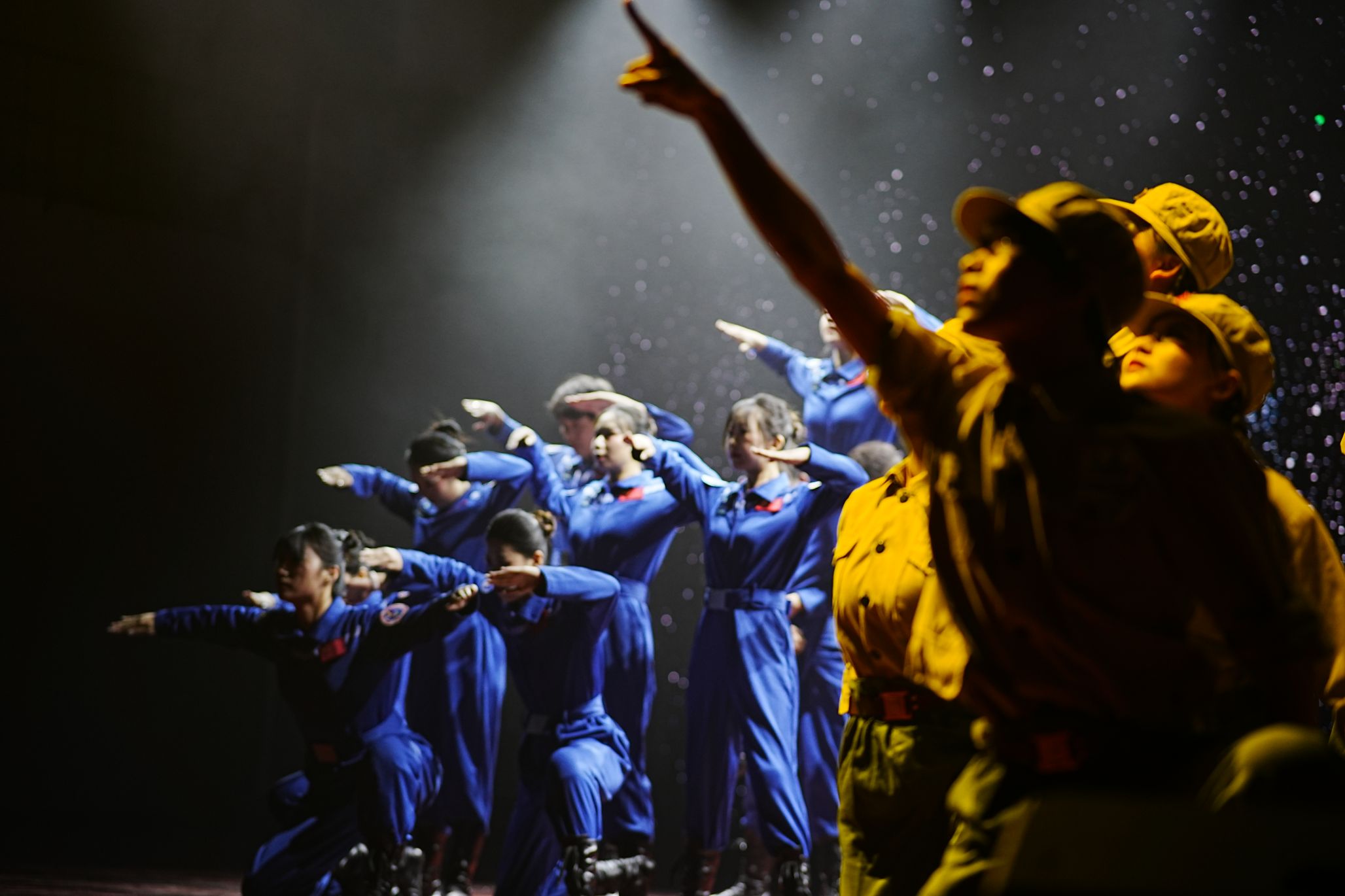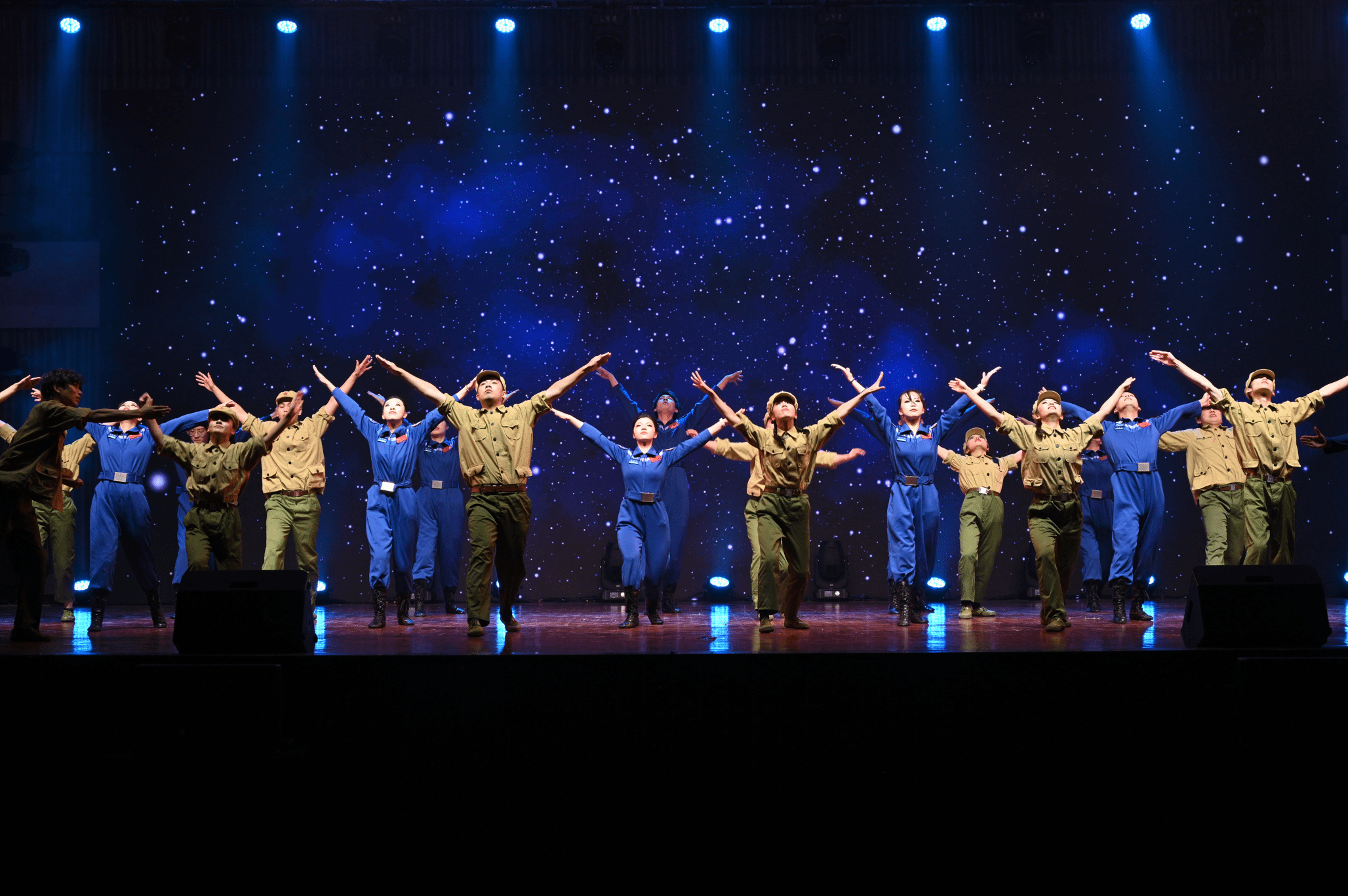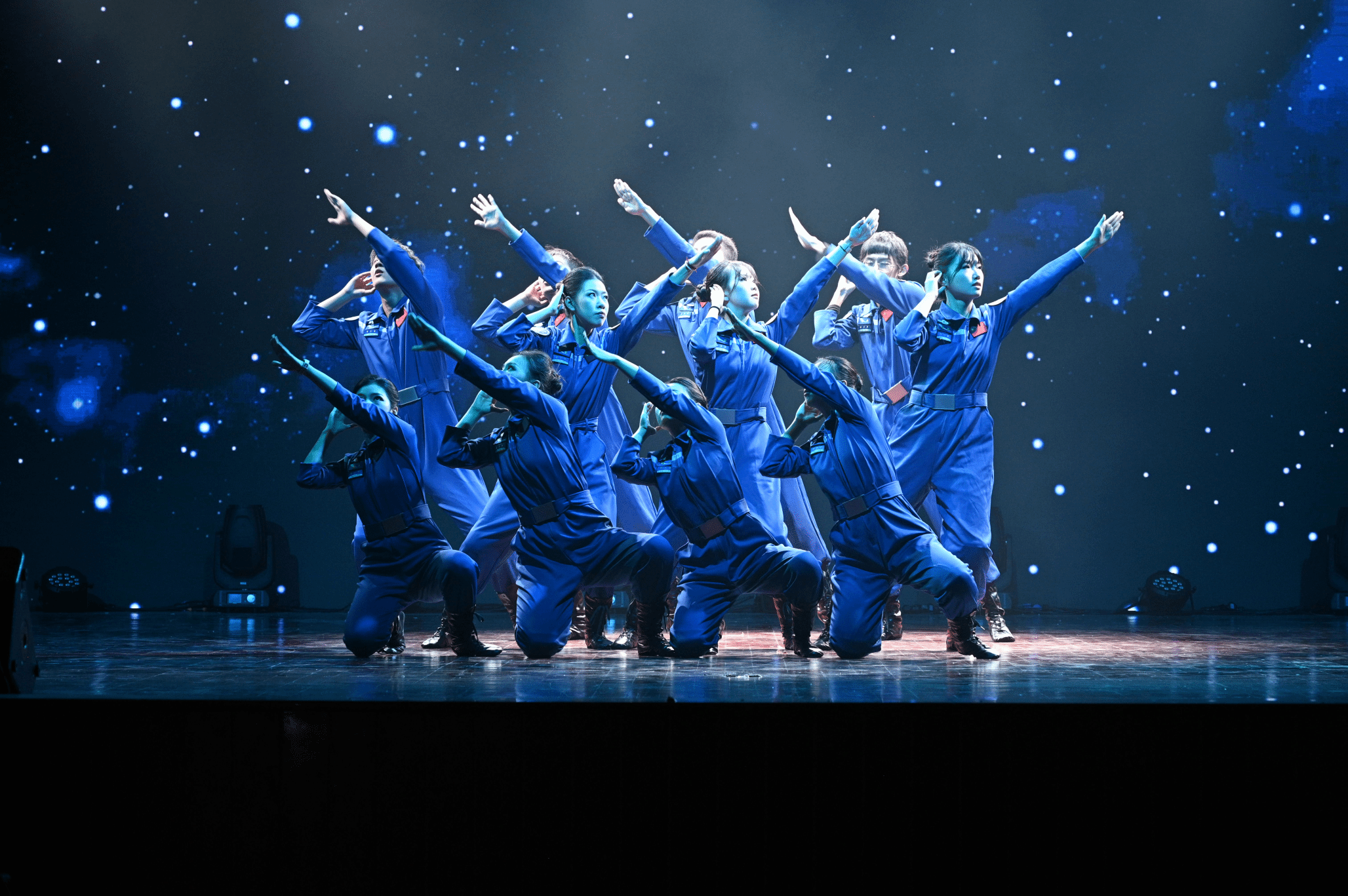 舞蹈深情地描绘了两代航天人接力奋斗的壮丽画卷,那是老与新在时间长河中的一次深情握手,是智慧与勇气在岁月里的璀璨交响。在研究初期,科研人员与军人的面色凝重深沉,此时的舞蹈,节奏紧张急促,仿佛科研人员心中的脉搏,随着研究的深入与实验的推进而加速跳动。当那颗承载着无数科研人员心血与梦想的卫星终于成功发射,划破天际,绽放出璀璨的光芒时,科研人员与军人们的脸上露出了难以抑制的喜悦与自豪。表演的情绪层层递进,让看者仿佛身临那个风云际会的年代,参与那场只争朝夕的事业,体会无数艰难险阻之后的成功的喜悦。