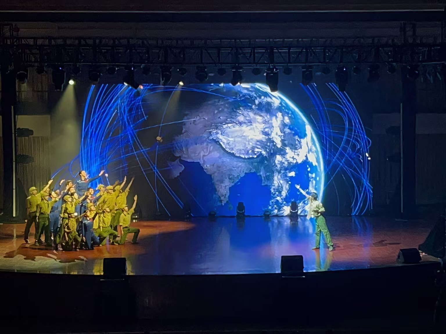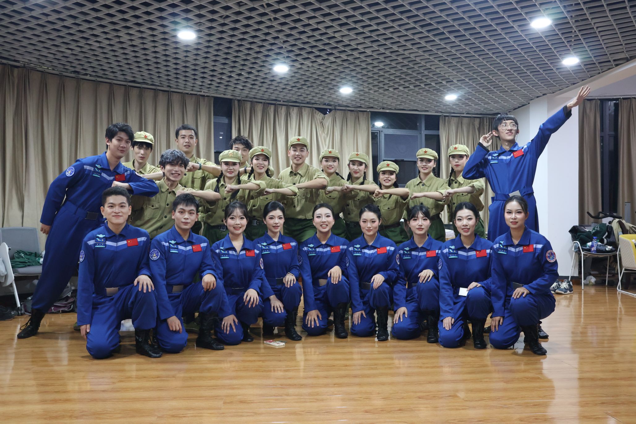 舞台上,同学们以细腻的舞蹈语言,生动再现了卫星发射的壮丽场景。从火箭点火升空的激情瞬间,到卫星展板缓缓展开的神秘画卷,再到聆听遥远太空传来卫星信号的激动时刻,每一个动作都蕴含着科研人员与军人的智慧与汗水,展现了他们为卫星事业不懈奋斗的崇高精神。