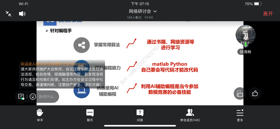 伴随着同学们的思维碰撞,本次华为杯研究生数学建模竞赛经验分享会圆满结束。孙海畅同学的经验分享深入浅出,吸引了众多对数学建模竞赛感兴趣的同学参与。与会同学纷纷表示此次活动干货满满,对于自己的竞赛准备很有意义。相信同学们在今后参与数模竞赛时,能从本次活动中汲取到宝贵的经验,在学术的海洋中勇敢探索,创造属于自己的辉煌!