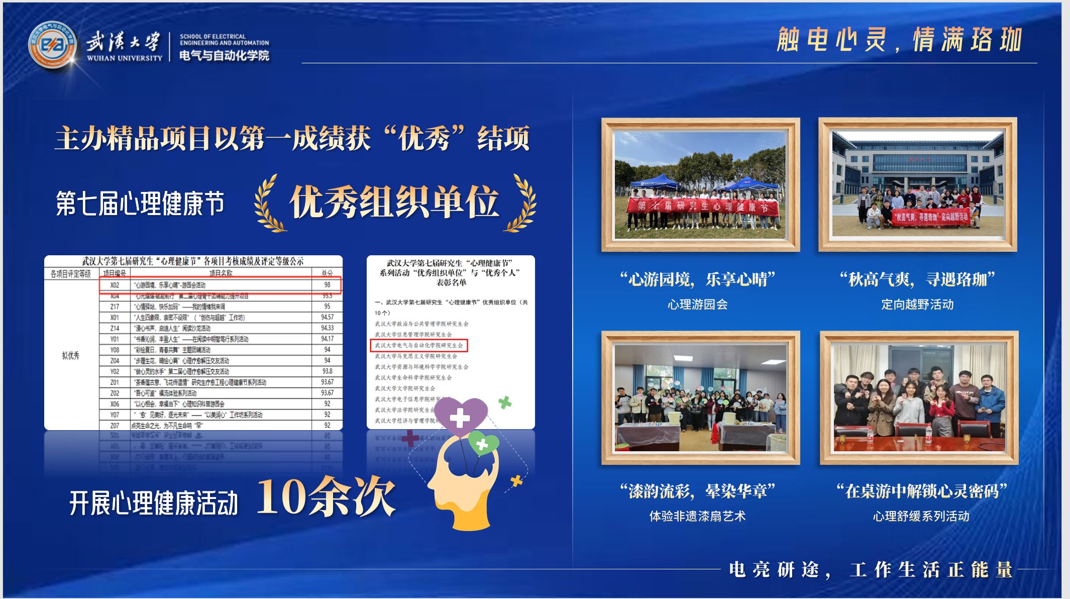 电气研会设立心理沟通渠道“解忧树洞”,创立班级心理委员沟通群,构建了完善的院-会-班三级心理速报机制;发表心理推文27篇,普及心理健康知识,帮助研究生更好地了解自己的内心世界。;举办心理健康活动10余次,主办精品项目以第一成绩获优秀结项,荣获第七届心理健康节“优秀组织单位”;
