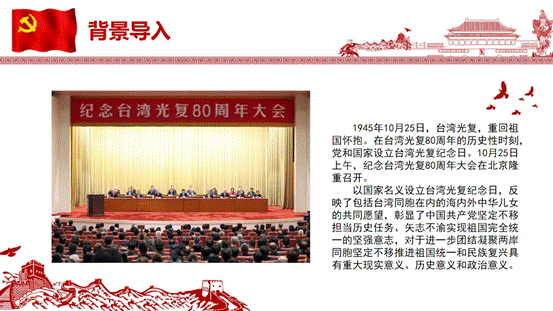 活动在激昂雄壮的团歌齐唱中拉开帷幕,嘹亮的歌声传递着团员们对党和国家的赤诚热爱。在背景导入环节,通过央视新闻权威片段与纪念台湾光复80周年大会场景的呈现,团员们共同了解了台湾光复纪念日设立的背景与意义。