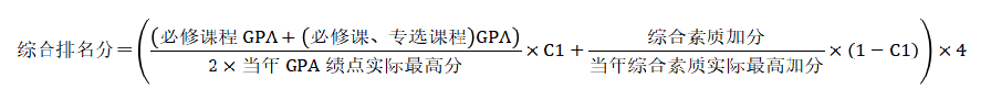 第七条 学院按课程成绩(课程成绩按照首次考试成绩计算)占C1,综合素质加分占(1-C1)制定综合评价标准,计算申请人的综合排名分。根据本专业所有申请人的综合排名分进行排序,额满为止,如果排名在前的申请人放弃其推免资格,则依次递补。综合排名分计算公式为: