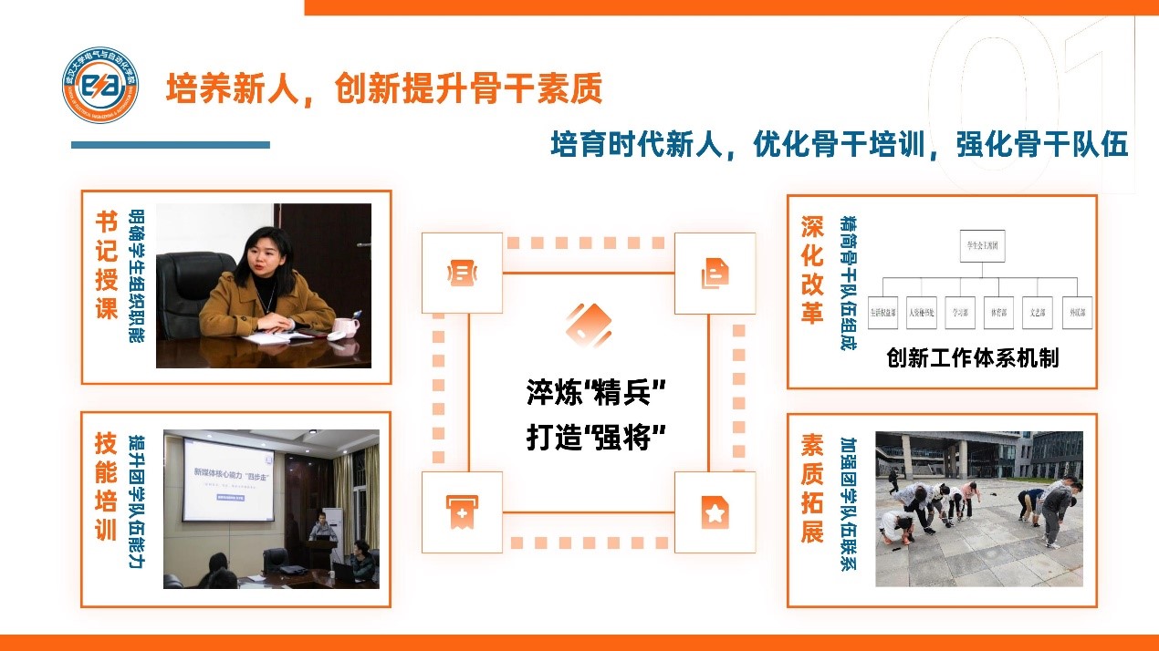 淬炼“精兵”,优化骨干培训。领导老师亲临指导,明确学生组织职能;技能培训内容多元,全面提高团学队伍能力。