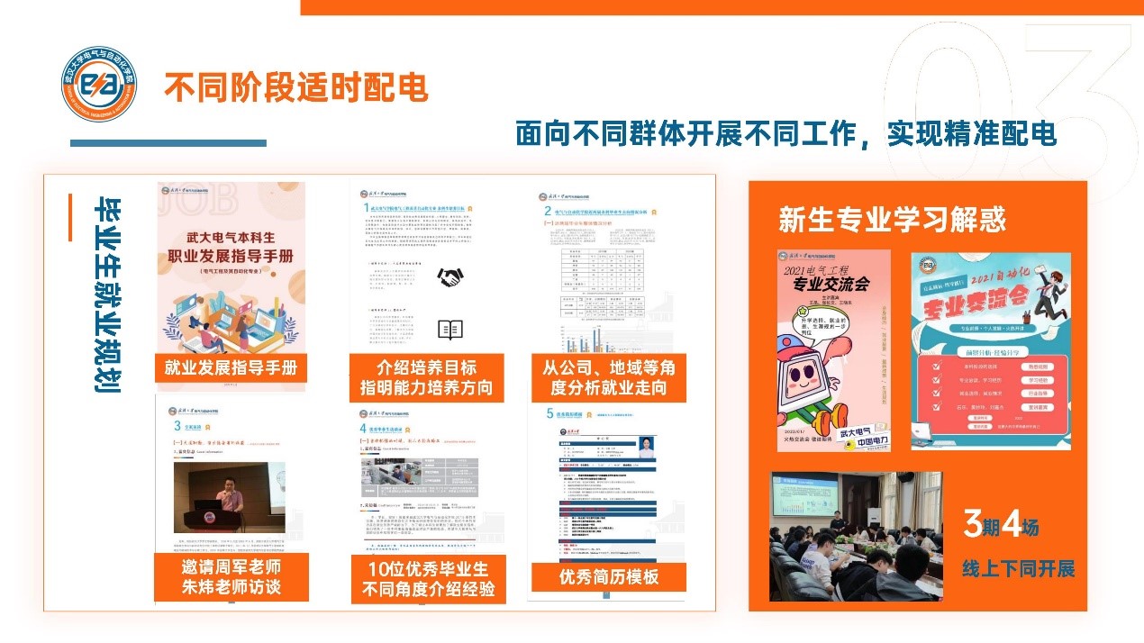 针对新生专业分流困惑,联合优秀学生校友,开展三期四场专业交流会;聚焦毕业生职业发展规划,修订《电气本科生职业发展手册》,十余项线上下就业活动精准指导,三场线上集中宣讲提升就业质量。