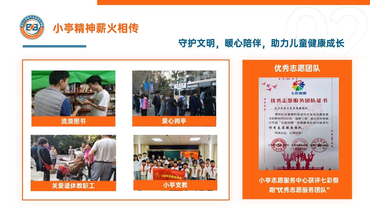 小亭精神薪火相传。这一年,流浪图书传承良好学风,爱心岗亭守护文明礼让,关爱退休教职工暖心陪伴,小亭支教助力留守儿童健康成长。小亭志愿服务中心获评七彩假期“优秀志愿服务团队”,被主流媒体广泛报道。