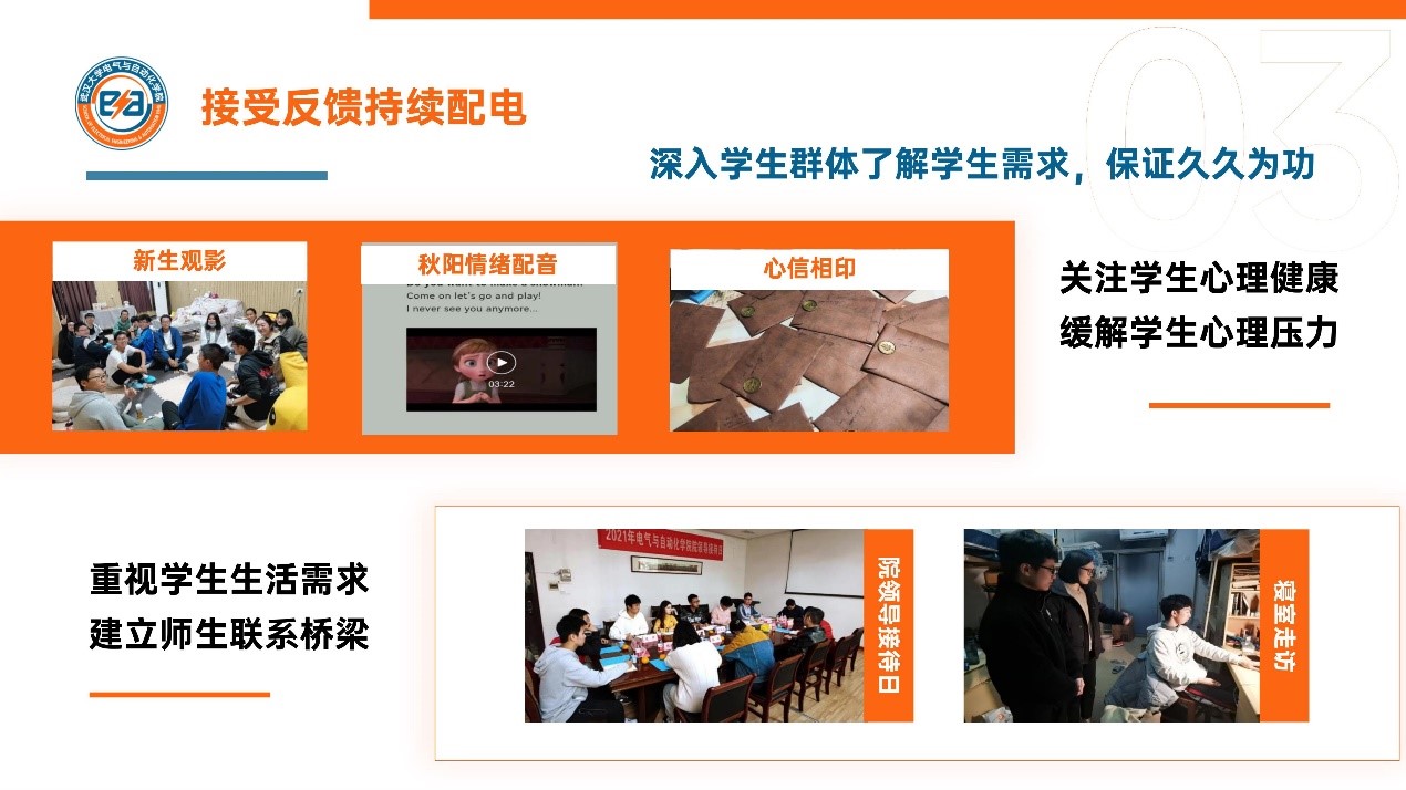 关注学生心理健康,新生观影、秋阳情绪配音大赛、秋韵心信相印书信漂流,缓解学生心理压力;重视学生生活需求,院领导接待日创造师生面对面交流机会,寝室走访建立师生沟通联系桥梁。