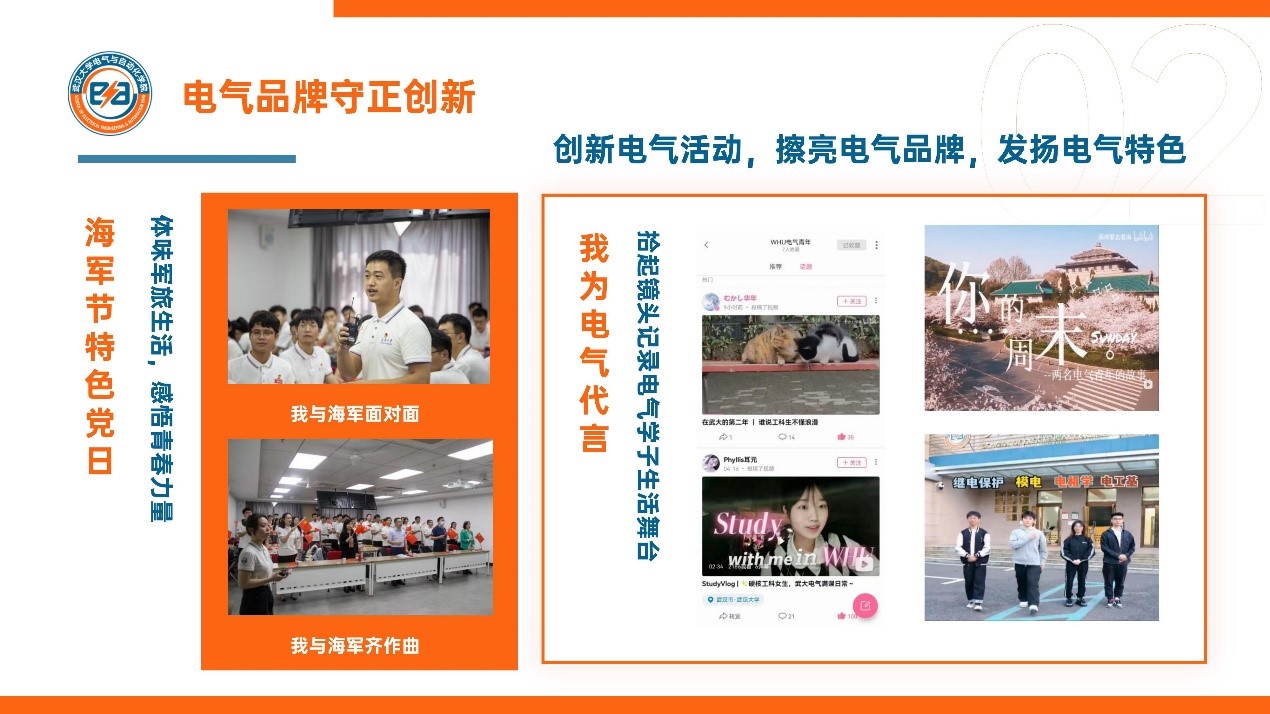 电气品牌守正创新。华中高校电力文化节引领前沿,海内外校友倾情助力,线上下互动多元开展,学术前沿、思想引领、骨干培训、未来规划,为两校同学集中输电;海军节特色党日感悟初心,牵头七大院系与海军战士面对面,体味军旅生活,感悟青春力量;“我为电气代言”短视频征集大赛传递心声,拾起镜头记录电气学子生活舞台,拼接瞬间展现电气青年青春姿态。