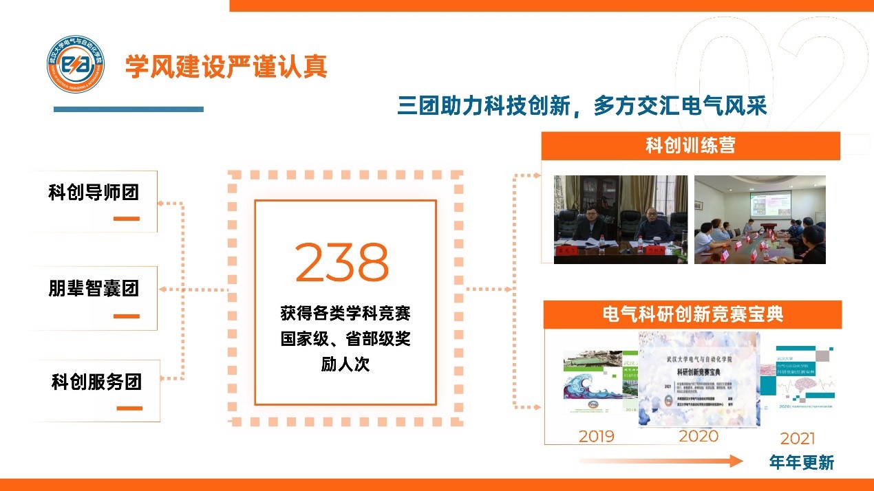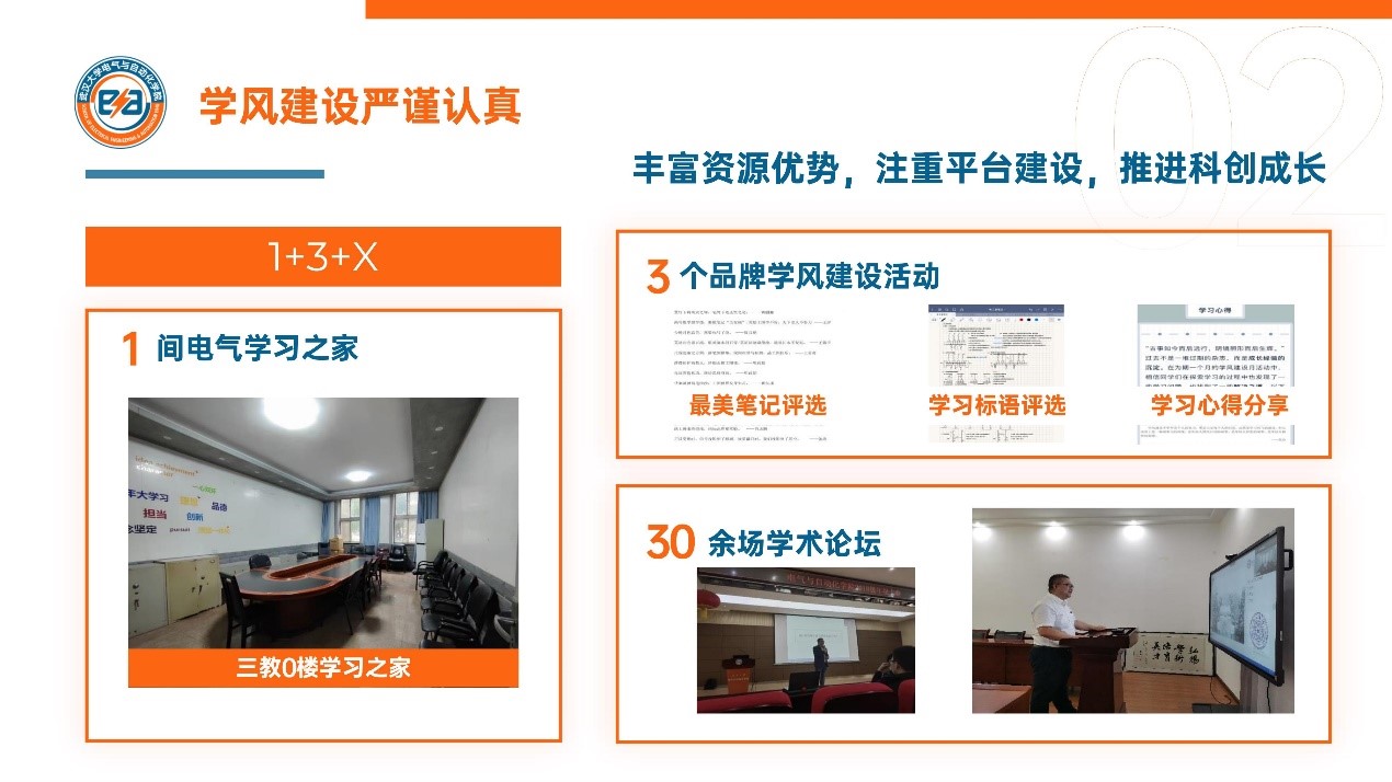 学风建设严谨创新。一间“电气学习之家”,3个品牌学风建设活动,30余场不同规格的学术交流会,加强学风建设,推进科创成长;《电气科研创新竞赛宝典》连年更新,人手一册;科创训练营期期都开,一年两课;科创导师团、朋辈智囊团、科创服务团三团助力科技创新,学院238人次获得各类学科竞赛的国家级、省部级奖项。