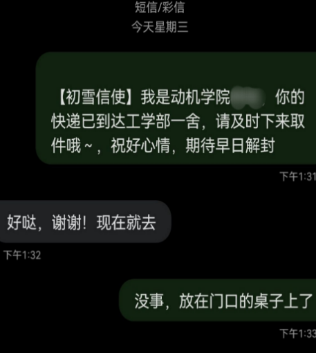 疫情形势严峻,学生封寝,包裹停滞,购置的生活用品不能及时送达。小亭志愿服务中心号召已解封的同学临时组成信使小分队,帮助未解封的同学取出封存已久的快递。