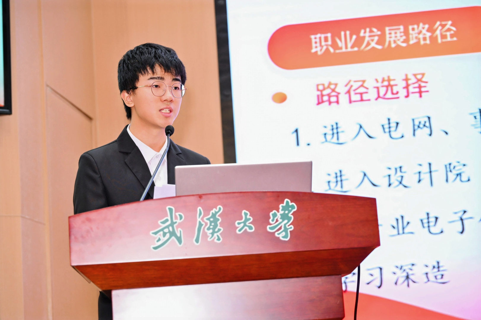 赵金利作总结讲话。他指出,电气学院在职业规划教育方面成果斐然,去年作为全校唯一本研均获最佳组织单位的学院,荣获湖北省金奖1项、校级金奖2项,学生参与率大幅领先。这得益于学院从日常课程行业认知引导,到赛前导师悉心指导,再到搭建企业实践平台的全链条育人模式,此次大赛的高水准便是学院育人实力的有力彰显。他强调,职业规划大赛的落幕是从“被动接受培养”迈向“主动谋划人生”的关键起点。他希望电气学子始终保持对专业的敬畏心与求知欲,坚守专业初心、秉持开放视野、永葆责任担当,把个人理想融入国家发展大局,在服务国家战略中成就更有高度的人生。
