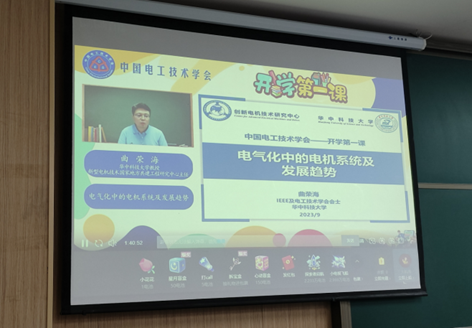 华中科技大学曲荣海教授从电气化中的电机系统及发展趋势角度进行开学第一课的讲授,通过他的讲解,同学们又一次了解到电气自动化在我们生活中无处不在、无处不有,了解到电气与自动化专业知识在水力、火力、核能发电、信息处理等民用领域的广泛应用。