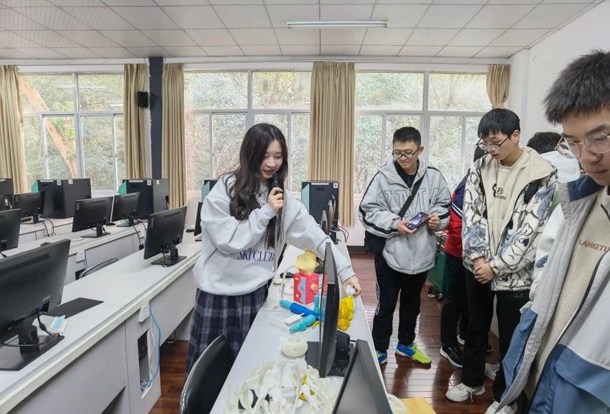 随后,同学们来到了 3D 打印实验室,这里摆放着许许多多学长学姐们的作品,他们将专业、兴趣爱好与3D打印相结合,种种奇思妙想让同学们赞叹不已。工创中心也为同学们准备了 3D 打印通识课,同学们可以在课上学习 3D 打印技术,并自由地进行打印创造。这门课程在武大备受欢迎,可谓是一课难求!