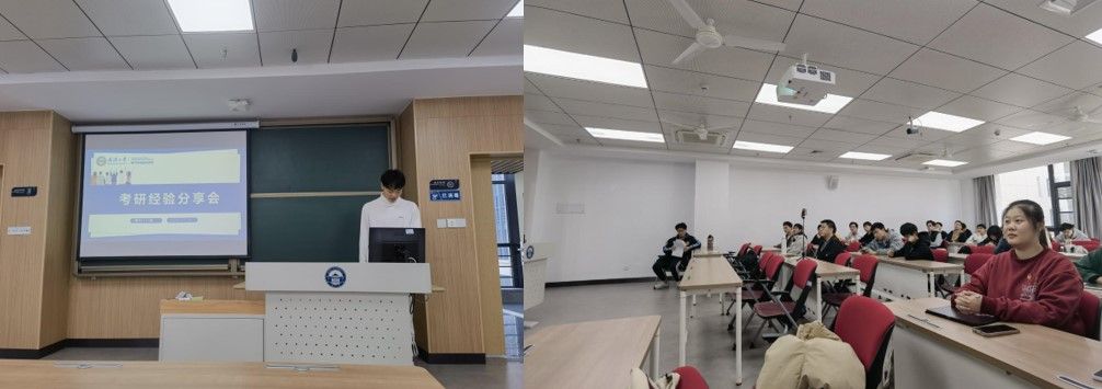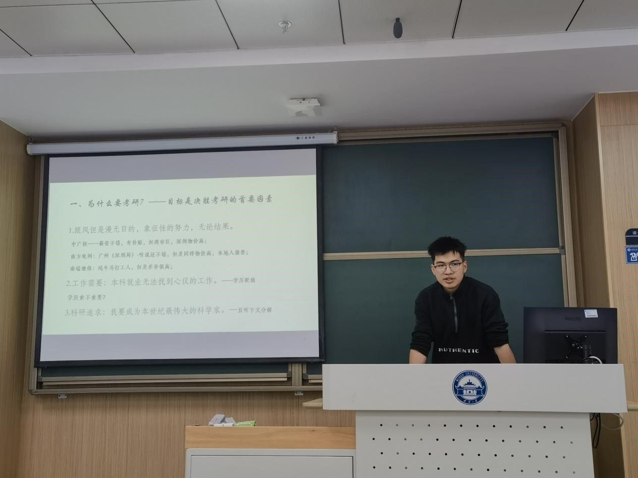 的招录情况、初试和复试科目为例子,详细介绍了考研择校的技巧——一定要了解目标院校学硕、专硕的考试科目、考试范围以及成功难度(专业课、报录比等方面)。吴泽梁以自己考研冲刺、上岸本校的经历为参考,分享了考研准备的开始时间、每个科目所用的教材和练习题以及复习的步骤。最后,他向同学们分享了自己的心得体会,鼓励同学们迎难而上,并送上了自己的祝福。