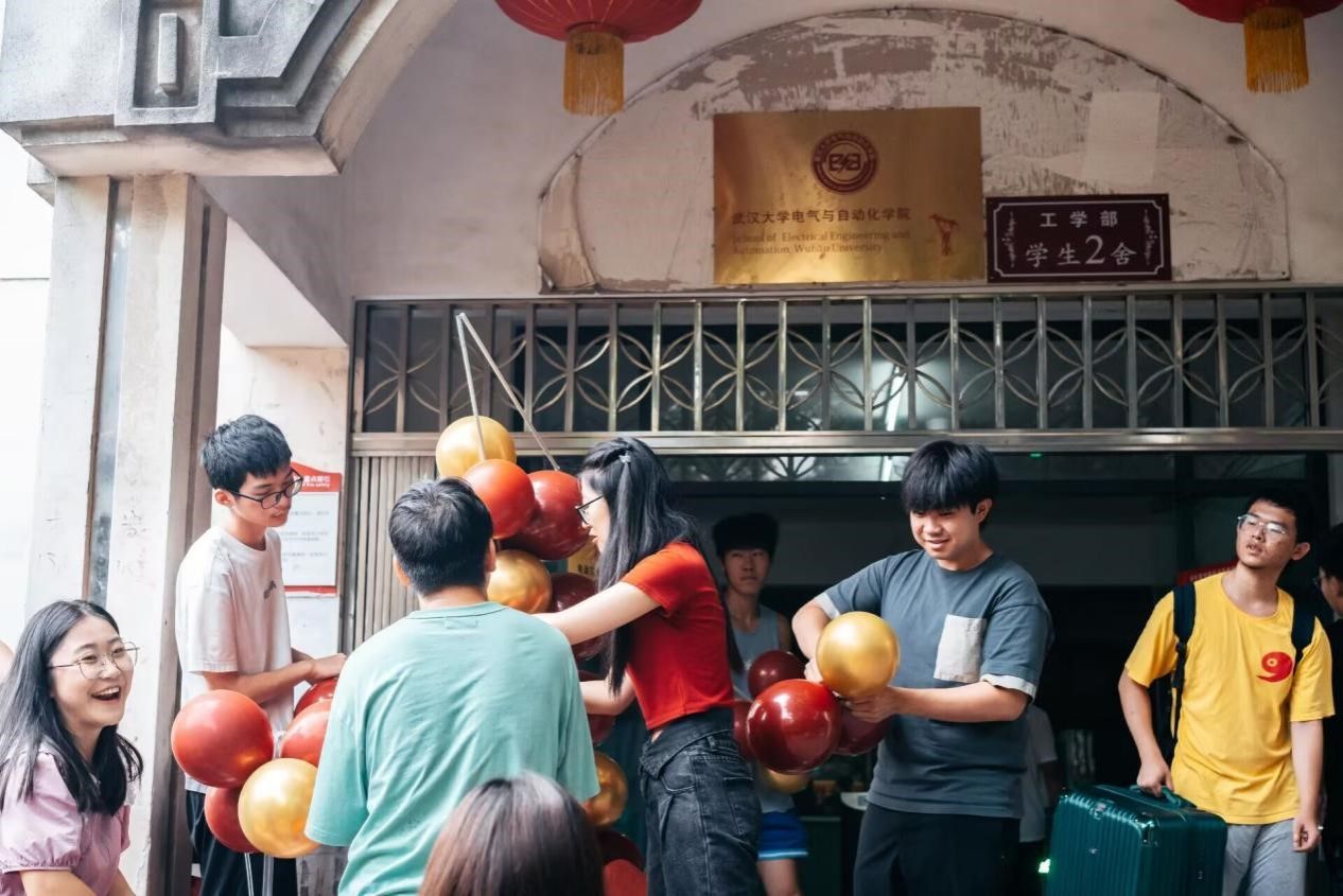 2022级主席团的成员们正在为搬宿舍的同学们“惊喜”:踩着红毯迈进电气,今天电气学院的主角便是搬家的新同学。一个个染着鲜艳的”电气红“的气球组成的拱门,是学院热情的欢迎,亦是殷切嘱托,“武大电器,中国电力”的口号随气球一起扶摇而上,将今天的氛围感拉满!
