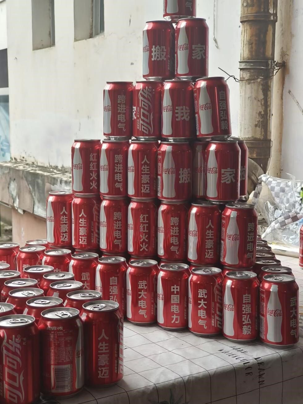 酷热的天气少不了快乐水相伴,特别是如此耗费体力的搬家活动。“武大电气”“自强弘毅”“我们搬家啦”等定制可乐配上口号给酷暑搬家的同学们送去了一份清凉。精心布置的可乐塔象征着电气学院的凝聚力。“迈进电气,人生豪迈”未来的人生天地是你留给时间的注脚,背着大包小包走进宿舍的那步或许就是你常常会回忆起家。