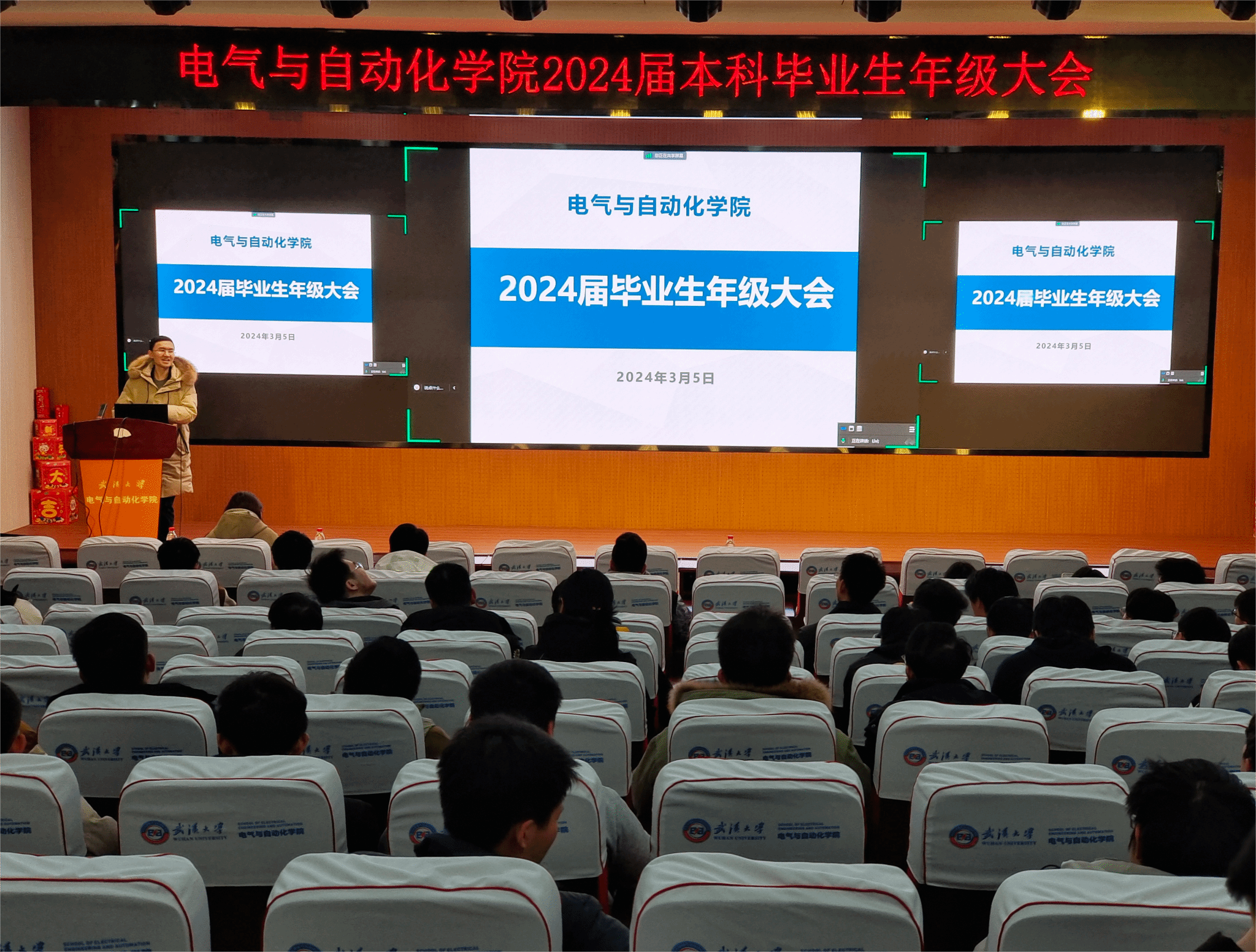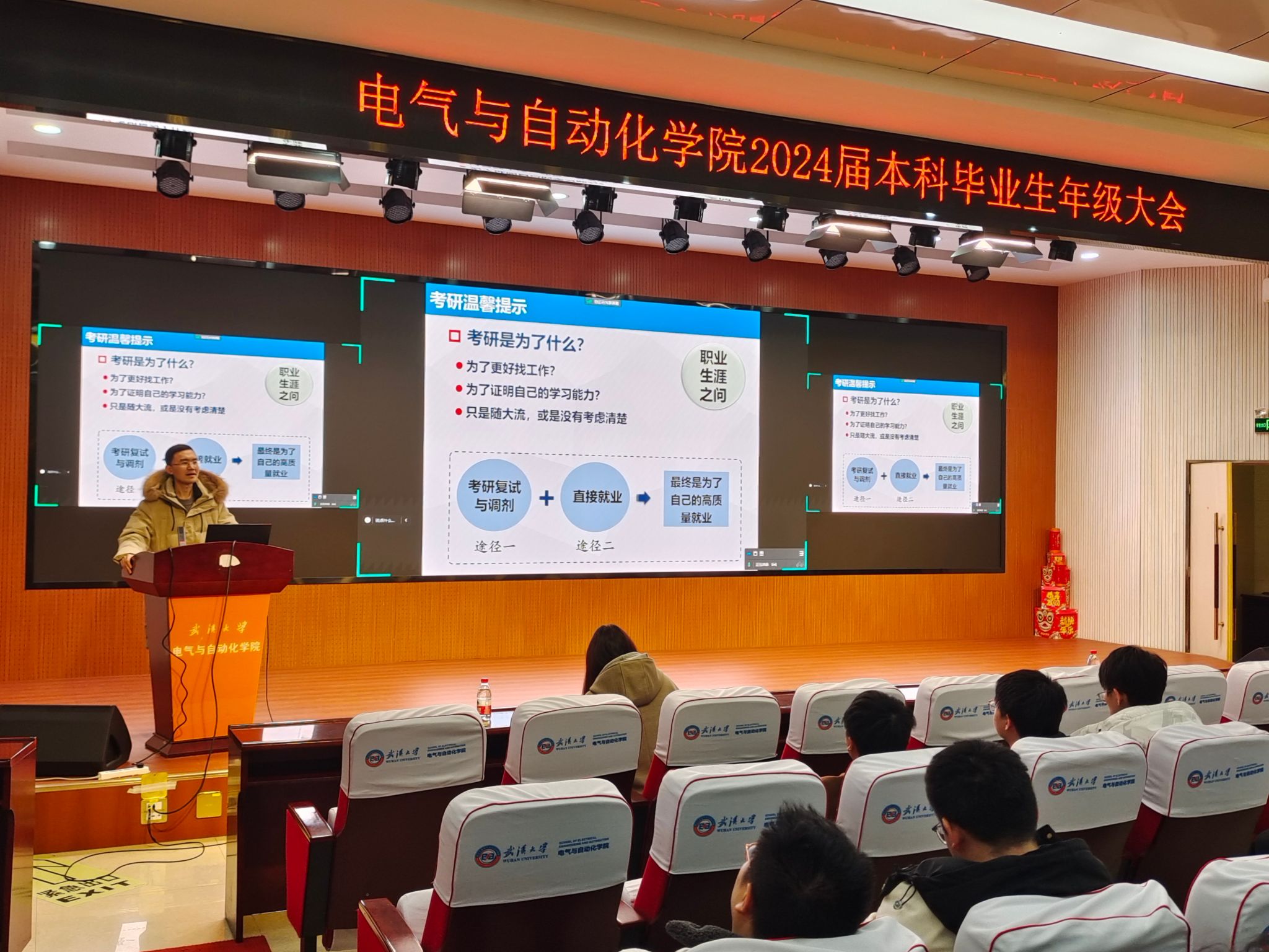 辅导员周兵奇老师为同学们强调了新学期的各项工作安排。第一,安全工作,要求同学们绝不把电动车电瓶带进宿舍充电,一定注意人身安全。第二,考研工作,要主动思考自己未来的人生发展,做出当下最适合自己的抉择。第三,就业工作,为同学们归纳总结了两大方面四大类工作,从大电力行业单位出发,逐类详细介绍了相关行业单位,提出用“主观出动+客观探索”的方式实现自己的高质量就业。第四,毕业安排,给出了毕业时间表,使大家明确新学期的学业安排,确保顺利毕业。第五,毕业生文集,一份礼敬武大电气岁月的珍藏式礼物,鼓励全体同学撰写大学四年总结、成长思考、保研、就业、考研经验等,为自己在武大的美好时光留下印记。