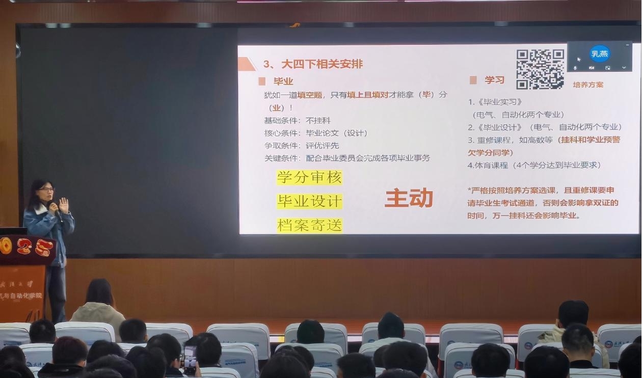 会议第三项,辅导员刘乳燕老师为同学们解读了大四下学期的注意事项。刘老师首先着重强调了学分审核自查的重要性,敦促同学们认真细致地做好学分自查工作,确保万无一失地达到毕业要求。对于接下来的关键时间节点,刘老师逐一梳理了考研复试与调剂时间、国家电网和南方电网第二批招聘考试时间等重要日程,再三提醒同学们提前做好充分准备,避免因疏忽而错过关键环节。她还就毕业离校手续办理、就业协议签订、档案寄送流程等事项进行了细致入微的说明,为同学们提供了全面、周到的指导。刘老师的讲解内容详实、条理清晰,让同学们对毕业前的各项任务和时间安排有了清晰的认识。