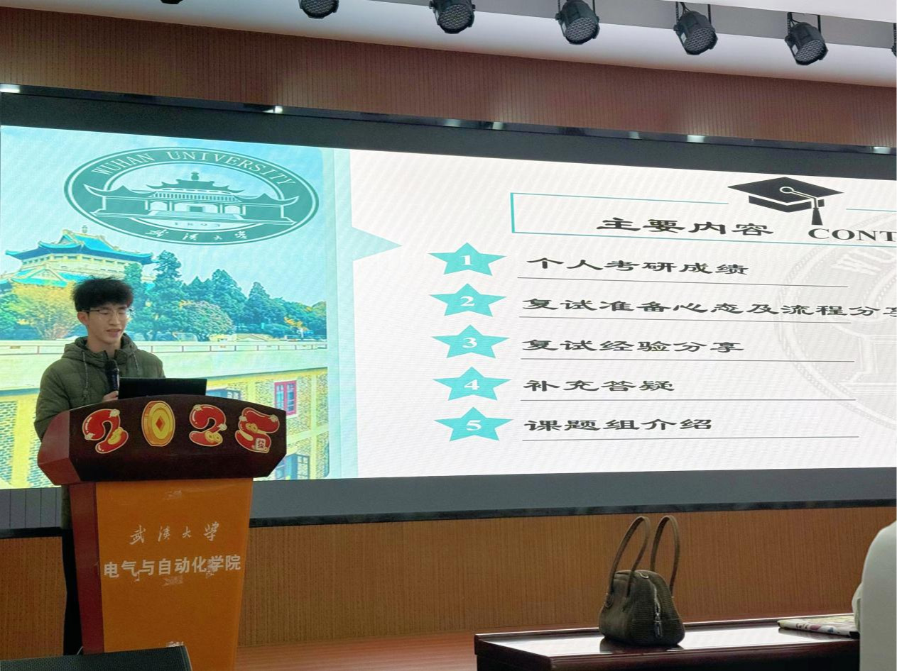 的优秀毕业生代表,分享了考研复试的宝贵经验。付骏杰同学从复试准备的前期规划、面试技巧的灵活运用,到专业能力的充分展示等多个维度,进行了鞭辟入里的讲解。付骏杰结合自身的考研历程,提醒学弟学妹们,要提前深入了解报考院校的复试特点,有的放矢地准备专业课知识和科研经历,始终保持自信从容的心态。此外,他还分享了与导师沟通的实用技巧,建议同学们在复试中清晰地阐述自己的学术规划,充分展现科研潜力。付骏杰的分享内容充实、条理清晰,为正在备考的同学们提供了极具实操性的指导。
