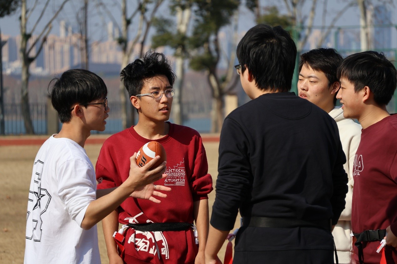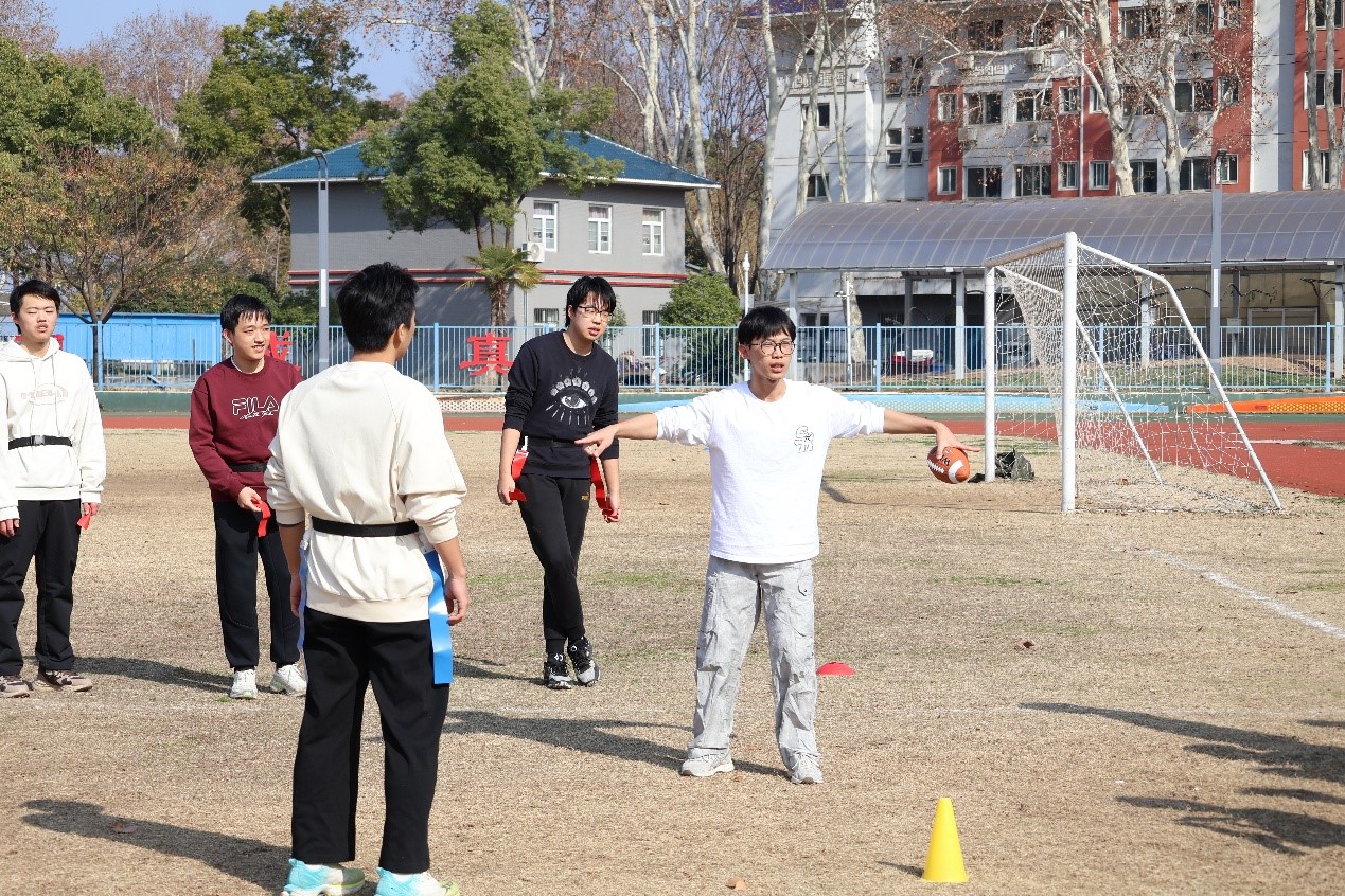 天气晴朗,风和日丽。在活动开始前,年级学生会副主席(主管文体)陈俊龙同学为大家详细讲解腰旗橄榄球的比赛规则。